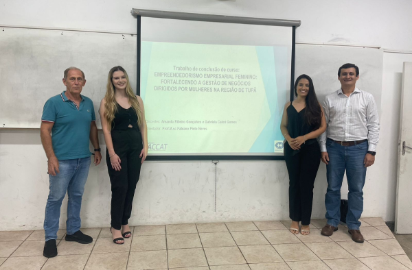 Defesa do TCC de Amanda Gonçalves e Gabriela Gomes em 03 de Dezembro de 2024, com a Banca Examinadora, Prof. Fabiano Neves (Orientador) e Manoel Alves, com o tema: Empreendedorismo empresarial feminino: fortalecendo a gestão de negócios dirigidos por mulheres na região de Tupã".
