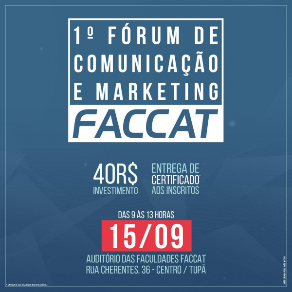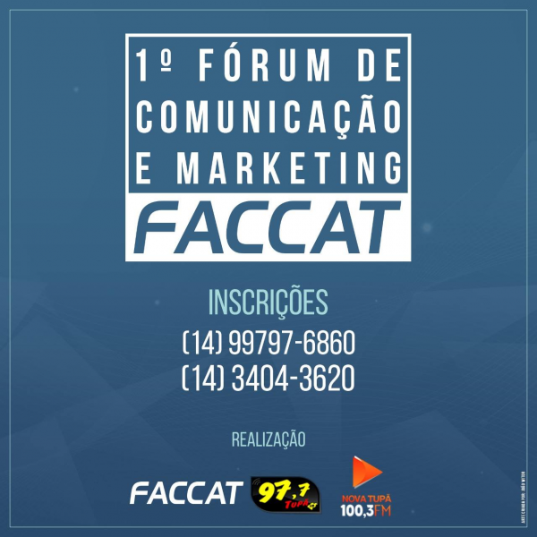 As Faculdades FACCAT, por meio dos cursos de Jornalismo e Publicidade e Propaganda, juntamente com as rádios Nova Tupã (100,3) e Tupã FM (97,7), promovem o 1º Fórum de Comunicação e Marketing. O evento acontece no dia 15 de setembro, no auditório da FACCAT, das 9 às 13 horas.